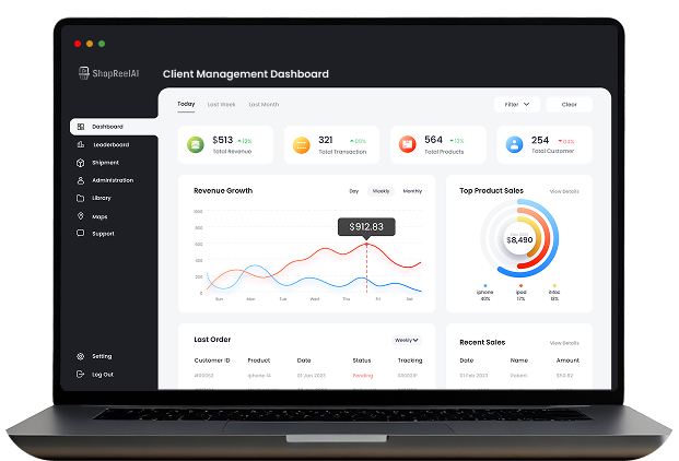 Rebrand the entire ShopReelAI platform as your own, complete with your logo, domain, and brand colors. Your clients will see you as the creator of this cutting-edge software, not us. Manage up to 100 client accounts and sell Done-For-You Affiliate Stores for $297–$997 each, instantly positioning yourself as a full-service affiliate automation agency.